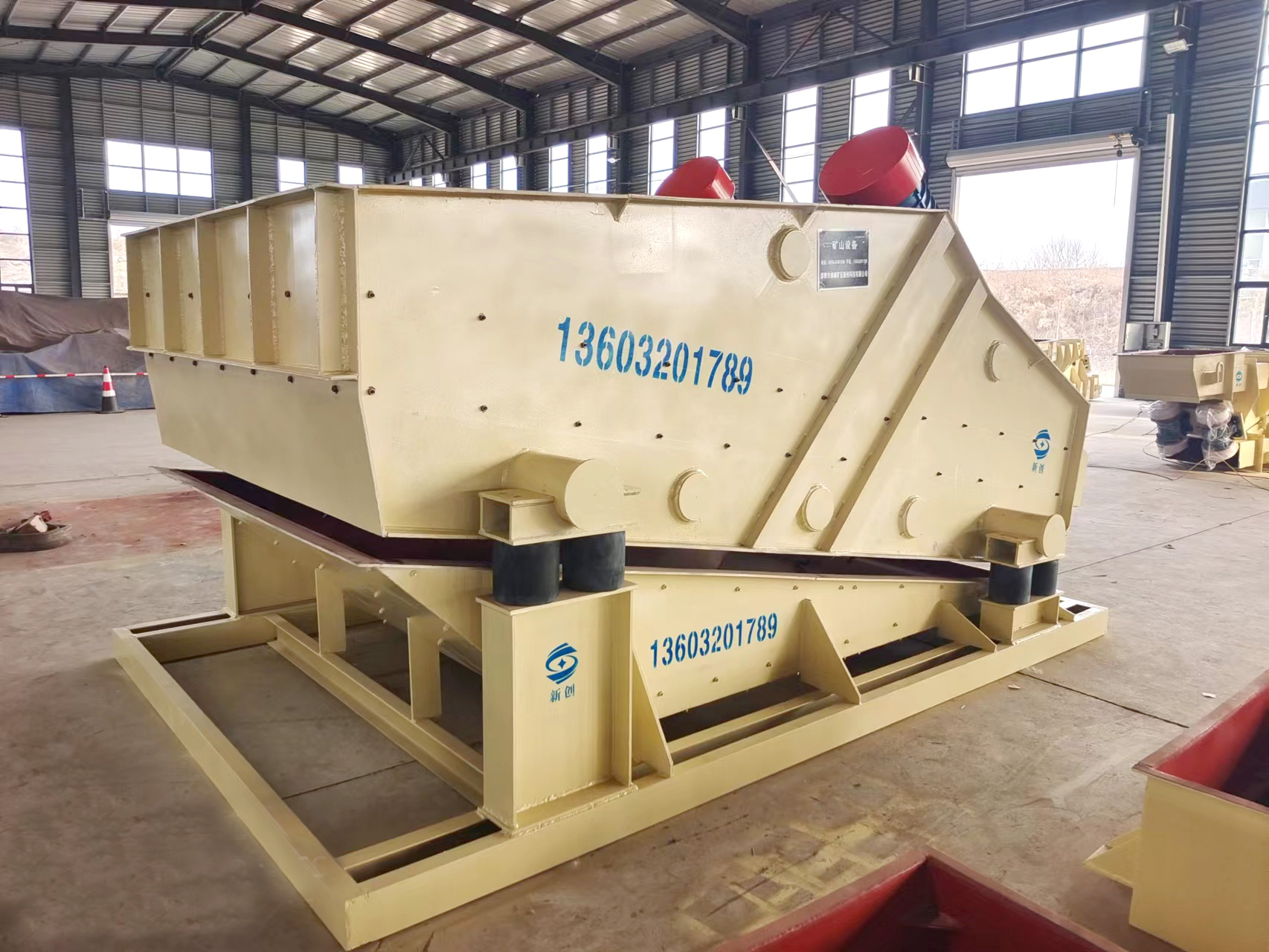 產(chǎn)品描述: 用于煤炭、水電、礦山、建材、化工、塑料、磨料、醫(yī)藥、糧食、炭素、化肥等行的設(shè)備 直線篩(直線振動篩)利用振動電機激振作為振動源,使物料在篩網(wǎng)上被拋起,同時向前作直線運動,物料從給料機均勻地進入篩分機的進料口,通過多層篩網(wǎng)產(chǎn)生數(shù)種規(guī)格的篩上物、篩下物、分別從各自的出口排出。具有耗能低、產(chǎn)量高、結(jié)構(gòu)簡單、易維修、全封閉結(jié)構(gòu),無粉塵溢散,自動排料,更適合于流水線作業(yè)?! 」ぷ髟怼 SG系列振動篩工作時,兩電機同步反向旋轉(zhuǎn)使激振器產(chǎn)生反向激振力,迫使篩體帶動篩網(wǎng)做縱向運動,使其上的物料受激振力而周期性向前拋出一個射程,從而完成物料篩分作業(yè). 直線振動篩是雙振動電機驅(qū)動。當兩臺振動電機做同步、反缶旋轉(zhuǎn)時,其偏心塊所產(chǎn)生的激振力在平行于電機軸線的方向相互抵消,在垂直于電機軸的方向疊為一合力,因此篩機的運動軌跡為一直線。兩電機軸相對篩面有一傾角,在激振力和物料自重力的合力作用下,物料在篩面上被拋起跳躍式向前作直線運動,從而達到對物料進行篩選和分級的目的。適用于粒度在0.074-5mm、含水量小于70%、無粘性的各種干式粉狀物料的篩分。給料粒度不大于10mm?! ZSF直線振動篩主要特點及適于行業(yè): 篩分精度高、處理量大、結(jié)構(gòu)簡單、耗能少、噪音低、篩網(wǎng)使用壽命長、密封性好、極少粉塵溢散、維修方便、可用于流水線生產(chǎn)中的自動化作業(yè)。 廣泛應用于化工、食品、塑料、醫(yī)藥、冶金、玻璃、建材、糧食、化肥、磨料、陶瓷等行業(yè)中干式粉狀或顆粒狀物料的篩分?! 』咎攸c 穩(wěn)定可靠、消耗少、噪音低、壽命長、振型穩(wěn)、篩分效率高等?! ZSF直線振動篩主要特點: 1、密封性好、極少粉塵溢散?! ?、耗能少、噪音低、篩網(wǎng)使用壽命長?! ?、篩分精度高、處理量大、結(jié)構(gòu)簡單。 4、全封閉結(jié)構(gòu)、自動排料、更適合于流水線作業(yè)?! ?、篩體各部分均采用扎制鋼板及型材焊接而成(部分組體間為螺栓連接)整體剛度好,牢固可靠。